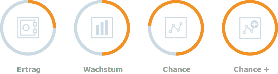Unser Ziel für Ihr Portfolio: Ca. 30 Aktien- und bis zu 20 Anleihentitel (keine Anleihen bei 100% Aktien "Chance +") für Sie herauszufiltern, deren Allokation ein global diversifiziertes Portfolio gemäß Ihrem individuellen Rendite-Risiko-Profil entspricht und den von Ihnen gewählten Themenschwerpunkten im Aktienbereich ermöglicht.
